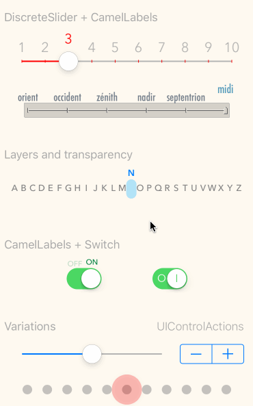 Ideal to select individual steps, star rating, integers, rainbow colors, slices and in general any value that is not a continuum. Just set the number of stops, TGPDiscreteSlider handles the selection and the animations for you.