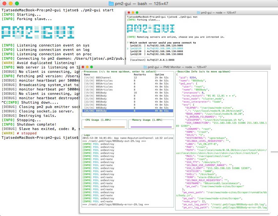 # Features - Curses-like dashboard. - Remoting monitor / web control. - All the heartbeats (no matter **monitor** or **tail (logs)**) are automatic destroyed. - The `PM2` processes are watched by a subscribed emitter. - Communicated with `PM2` through **RPC** socket directly. - Socket.io between client and server. - Monitor CPU and Memory usage of server in a real-time. - Monitor `PM2` processes in a real-time. - PM2 *restart/stop/delete*. - *stopWatch* files before *restart/stop/delete*. - *restartWatch* files before *restart*. - Supports [ANSI color codes](#ss_logs) by [ansi-html](https://github.com/Tjatse/ansi-html). - High performance. In my case, there are near one hundred processes, but `pm2-gui` works without any suck. # Cautions - Web Interface is wrote by CSS3 && HTML5, so view it with the latest version of the browser (WebGL, Animation, WebSocket supports), e.g. Chrome, Safari and Firefox. - I've never test it on Internet Explorer / Windows. # Installation ```bash $ npm install pm2-gui -g $ pm2-gui [options] # or $ npm install pm2-gui --production $ cd node_modules/pm2-gui # or (recommends) $ git clone https://github.com/Tjatse/pm2-gui.git $ cd pm2-gui $ npm install --production # run monitor $ ./pm2-gui [options] ``` # Usage Run the following command to get usage helps: ```bash $ pm2-gui ```